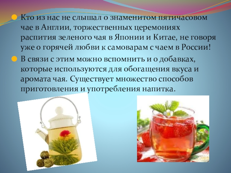 Слайд 9Кто из нас не слышал о знаменитом пятичасовом чае в