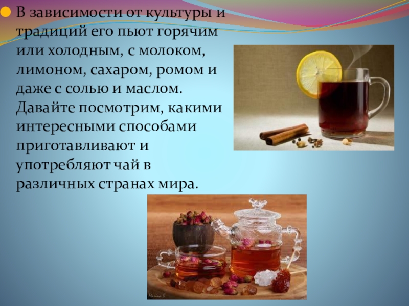 Слайд 10В зависимости от культуры и традиций его пьют горячим или