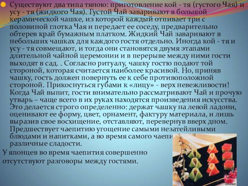 Слайд 18Существуют два типа тяною: приготовление кой - тя (густого Чая)