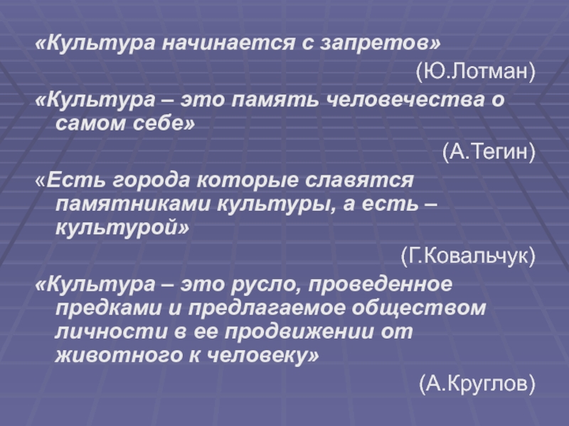 «Культура – это русло, проведенное предками и предлагаемое обществом личности в ее продвижении от животного к человеку»