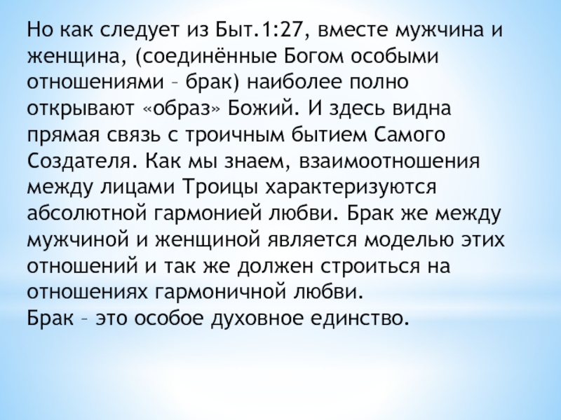 Божий. И здесь видна прямая связь с троичным бытием Самого Создателя. Как мы знаем, взаимоотношения между лицами Троицы характеризуются абсолютной гармонией любви. Брак же между мужчиной и женщиной является моделью этих отношений и так же должен строиться на отношениях гармоничной любви.