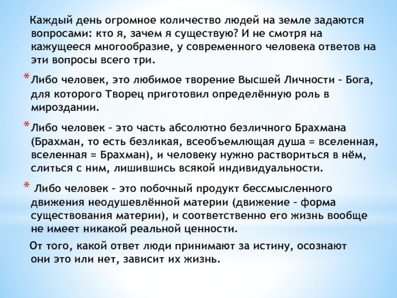 От того, какой ответ люди принимают за истину, осознают они это или нет, зависит их жизнь.