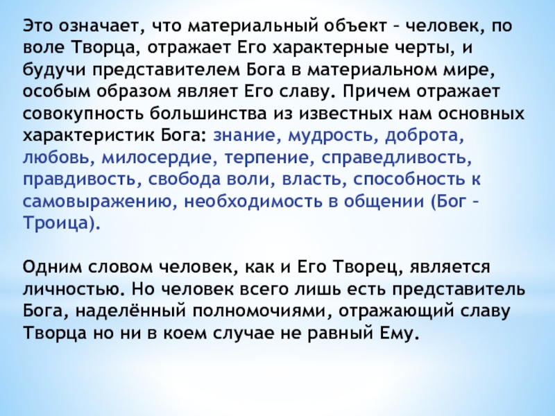 Слайд 5Это означает, что материальный объект – человек, по воле Творца,