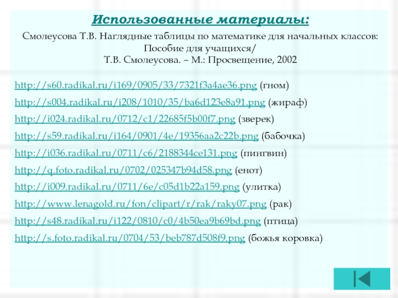 Использованные материалы:Смолеусова Т.В. Наглядные таблицы по математике для начальных классов: Пособие для учащихся/  Т.В. Смолеусова. –