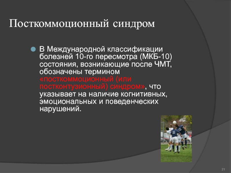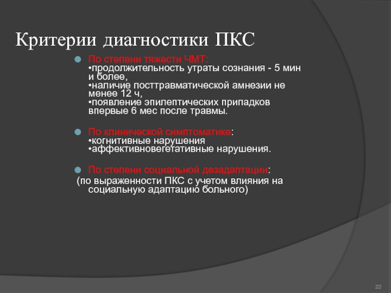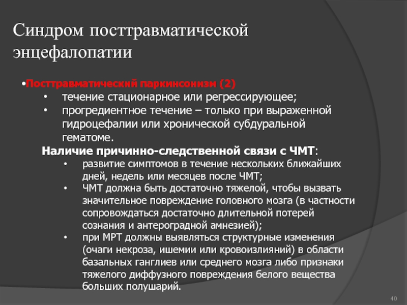 ЧМТ должна быть достаточно тяжелой, чтобы вызвать значительное повреждение головного мозга (в частности сопровождаться достаточно длительной потерей сознания и антероградной амнезией);