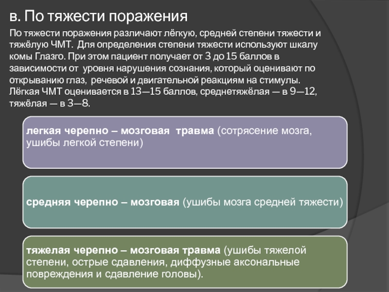 Глазго. При этом пациент получает от 3 до 15 баллов в зависимости от уровня нарушения сознания, который оценивают по открыванию глаз, речевой и двигательной реакциям на стимулы. Лёгкая ЧМТ оценивается в 13—15 баллов, среднетяжёлая — в 9—12, тяжёлая — в 3—8.