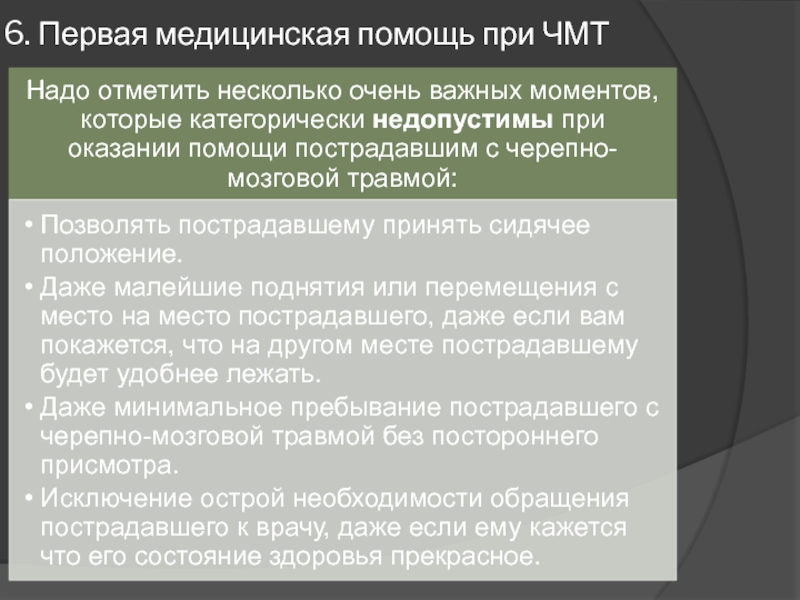 Слайд 136. Первая медицинская помощь при ЧМТ