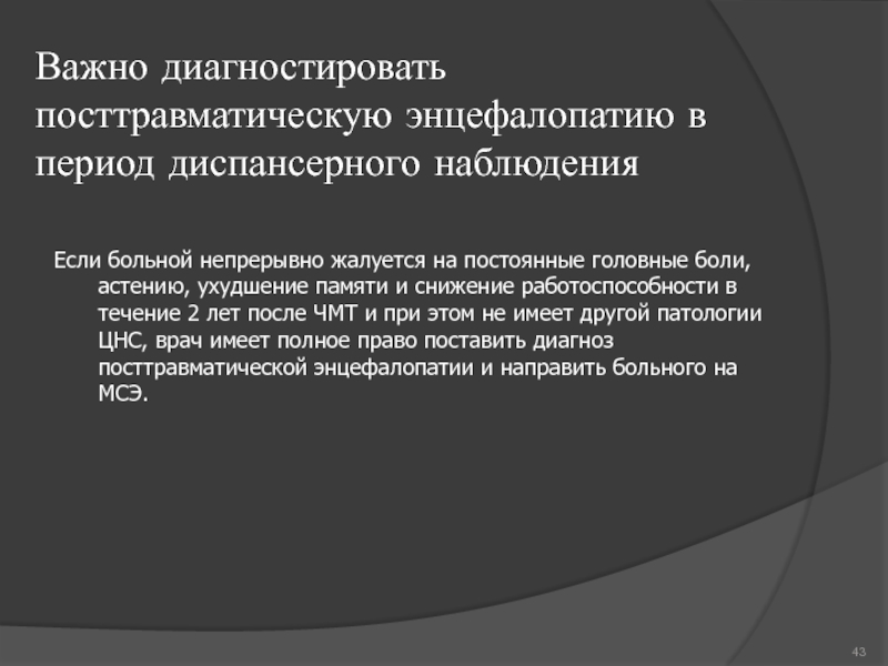 Слайд 43Важно диагностировать посттравматическую энцефалопатию в период диспансерного наблюдения