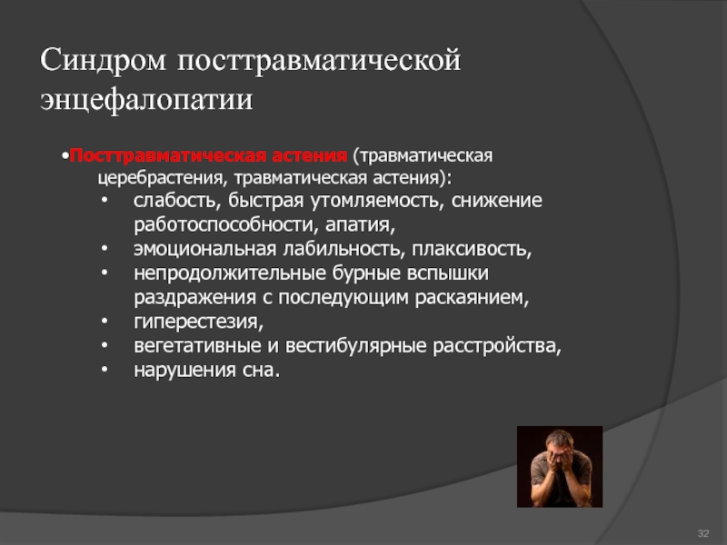 •Посттравматическая астения (травматическая церебрастения, травматическая астения):