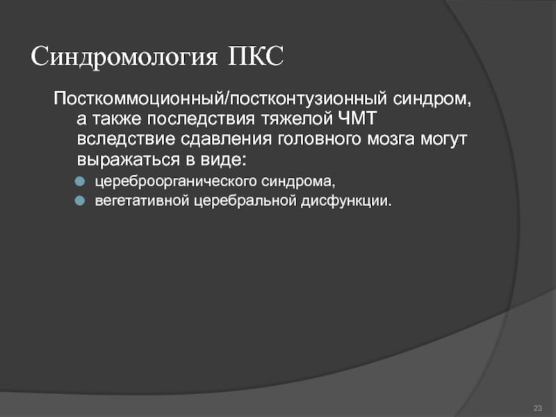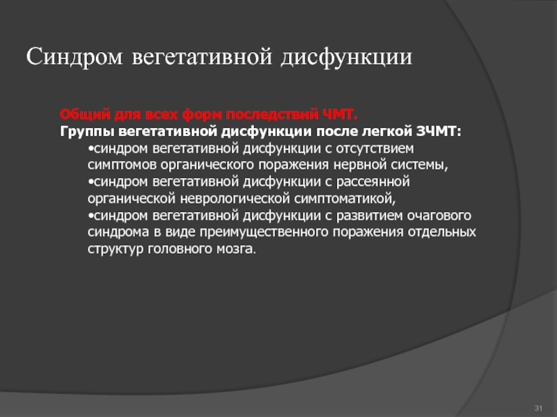 •синдром вегетативной дисфункции с развитием очагового синдрома в виде преимущественного поражения отдельных структур головного мозга.