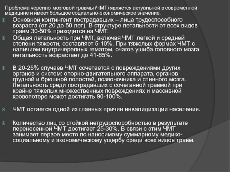 Слайд 3Проблема черепно-мозговой травмы (ЧМТ) является актуальной в современной медицине и