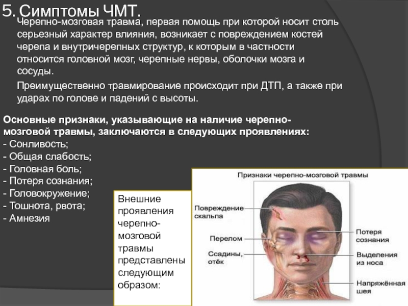 Основные признаки, указывающие на наличие черепно-мозговой травмы, заключаются в следующих проявлениях: