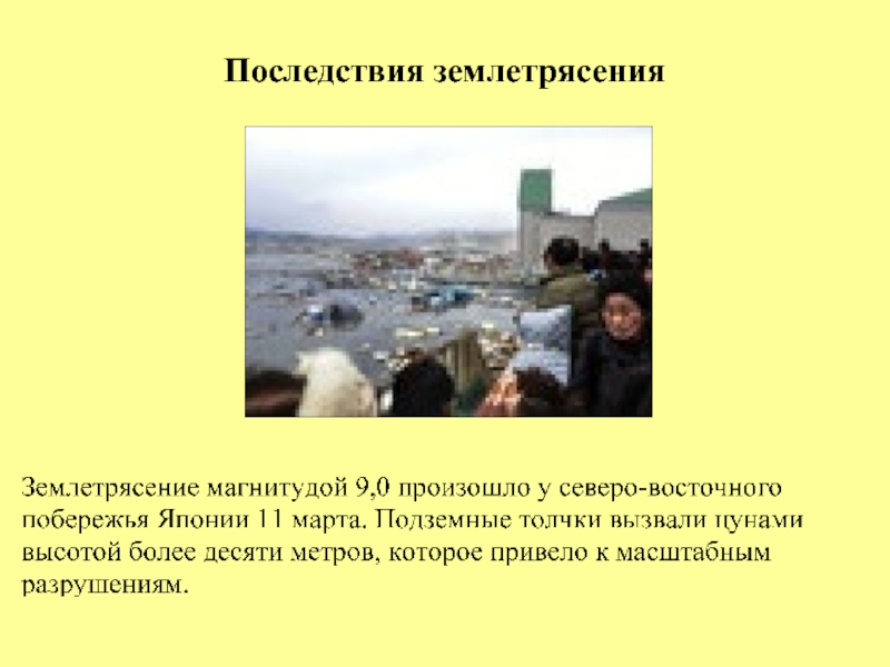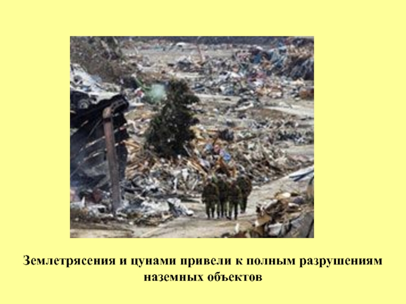 Слайд 21Землетрясения и цунами привели к полным разрушениям наземных объектов