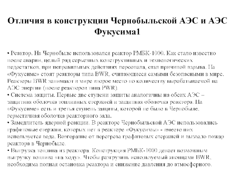 Слайд 9Отличия в конструкции Чернобыльской АЭС и АЭС Фукусима1