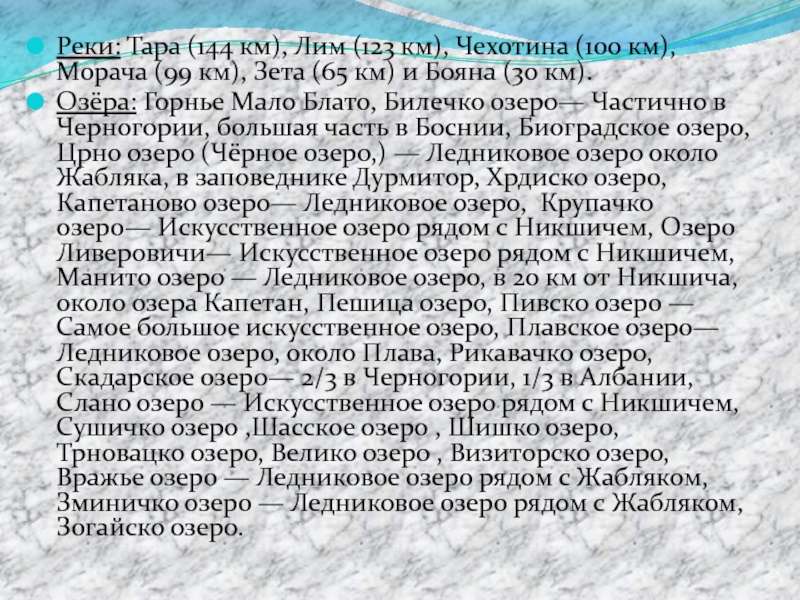 Слайд 5Реки: Тара (144 км), Лим (123 км), Чехотина (100 км),