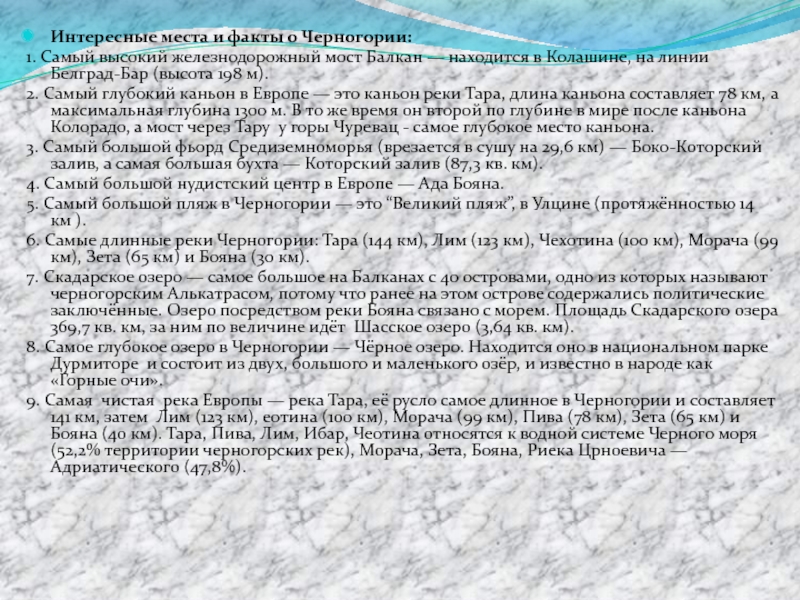 9. Самая чистая река Европы — река Тара, её русло самое длинное в Черногории и составляет 141 км, затем Лим (123 км), еотина (100 км), Морача (99 км), Пива (78 км), Зета (65 км) и Бояна (40 км). Тара, Пива, Лим, Ибар, Чеотина относятся к водной системе Черного моря (52,2% территории черногорских рек), Морача, Зета, Бояна, Риека Црноевича — Адриатического (47,8%).