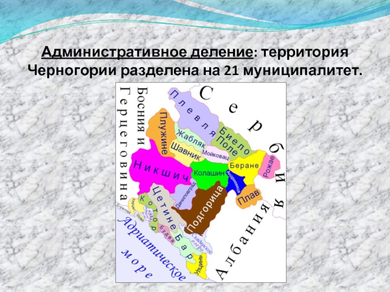 Слайд 6Административное деление: территория Черногории разделена на 21 муниципалитет.
