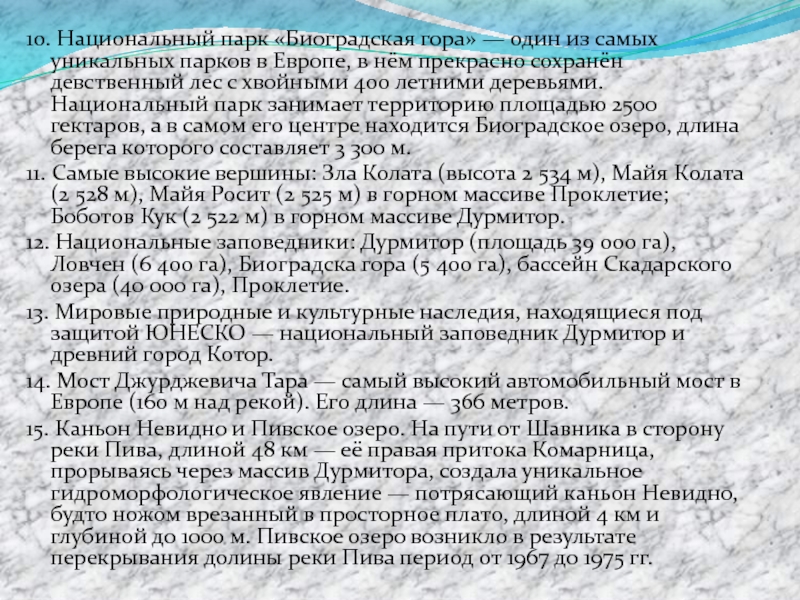 12. Национальные заповедники: Дурмитор (площадь 39 000 га), Ловчен (6 400 га), Биоградска гора (5 400 га), бассейн Скадарского озера (40 000 га), Проклетие.