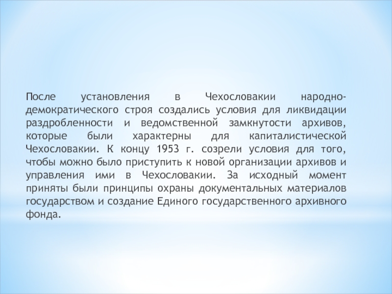 После установления в Чехословакии народно-демократического строя создались условия для ликвидации раздробленности и ведомственной замкнутости архивов, которые были характерны для капиталистической Чехословакии. К концу 1953 г. созрели условия для того, чтобы можно
