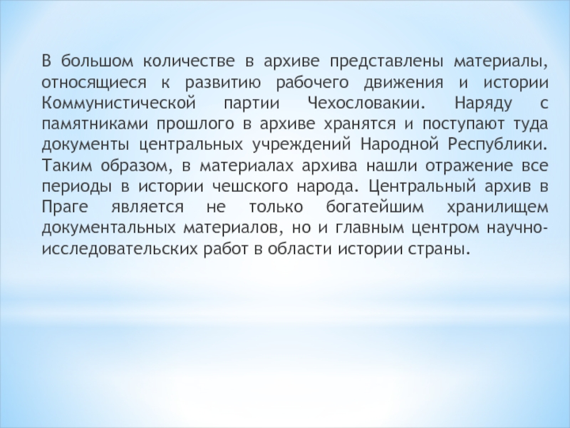 прошлого в архиве хранятся и поступают туда документы центральных учреждений Народной Республики. Таким образом, в материалах архива нашли отражение все периоды в истории чешского народа. Центральный архив в Праге является не только богатейшим хранилищем документальных материалов, но и главным центром научно-исследовательских работ в области истории страны.