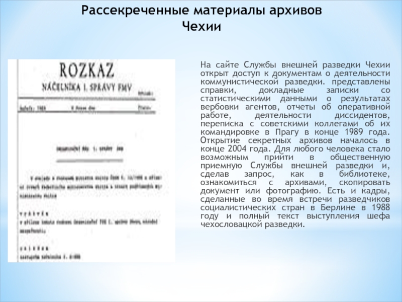 записки со статистическими данными о результатах вербовки агентов, отчеты об оперативной работе, деятельности диссидентов, переписка с советскими коллегами об их командировке в Прагу в конце 1989 года. Открытие секретных архивов началось в конце 2004 года. Для любого человека стало возможным прийти в общественную приемную Службы внешней разведки и, сделав запрос, как в библиотеке, ознакомиться с архивами, скопировать документ или фотографию. Есть и кадры, сделанные во время встречи разведчиков социалистических стран в Берлине в 1988 году и полный текст выступления шефа чехословацкой разведки.