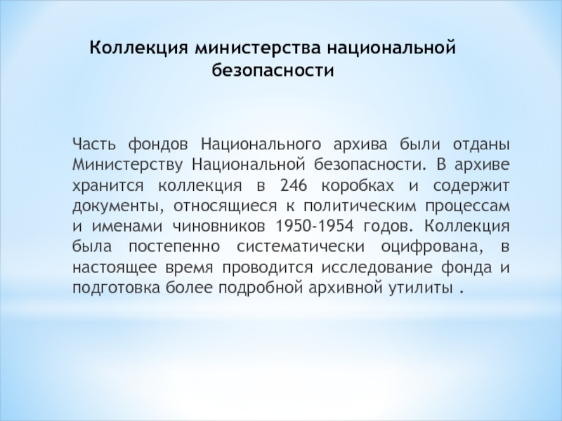 Коллекция министерства национальной безопасностиЧасть фондов Национального архива были отданы Министерству Национальной безопасности. В архиве хранится коллекция в