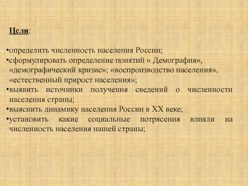 сведений о численности населения страны;выяснить динамику населения России в XX веке;
