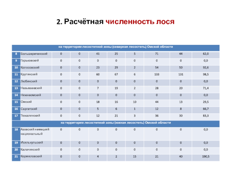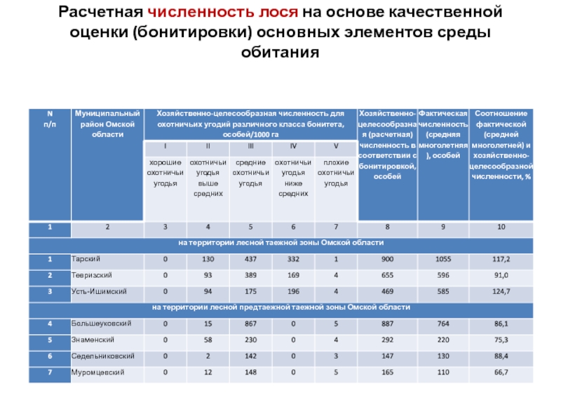 Слайд 15Расчетная численность лося на основе качественной оценки (бонитировки) основных элементов