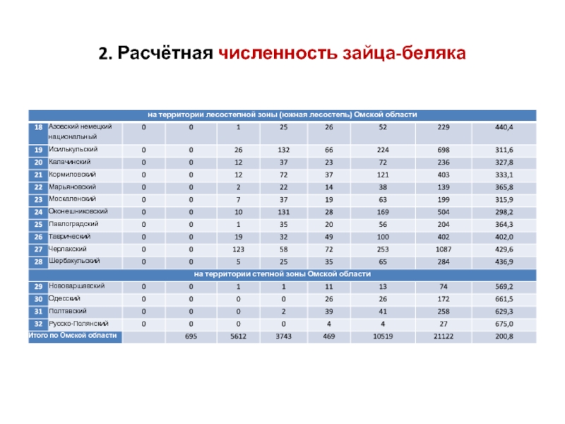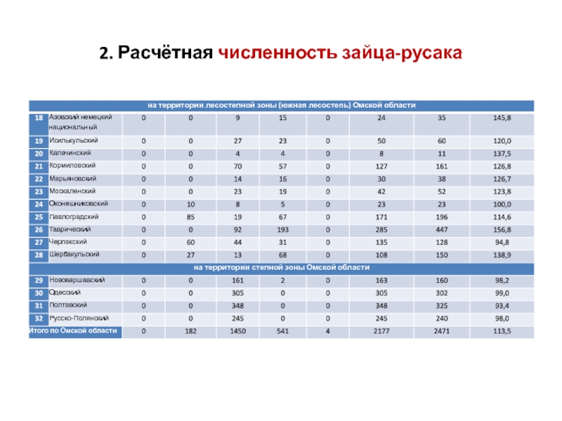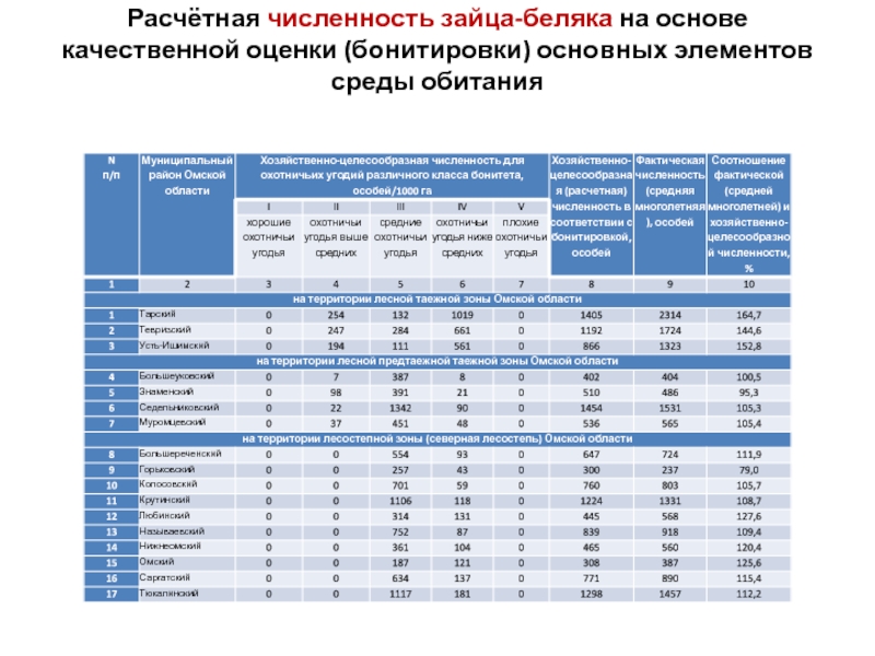 Слайд 8Расчетная численность зайца-русака на основе качественной оценки (бонитировки) основных элементов
