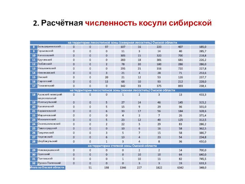 Слайд 17Расчётная численность косули сибирской на основе качественной оценки (бонитировки) основных
