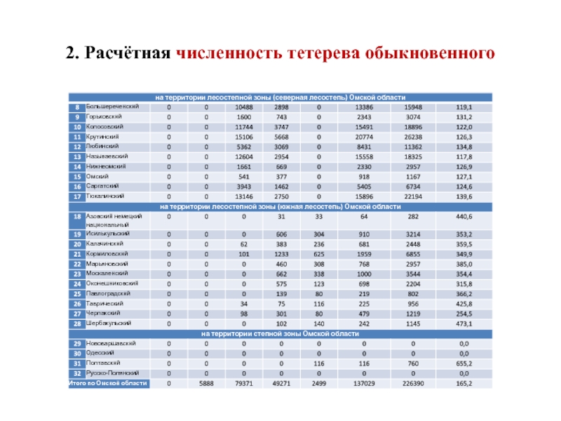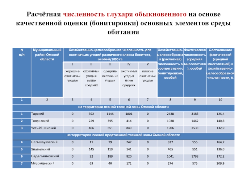 Слайд 22Расчётная численность тетерева обыкновенного на основе качественной оценки (бонитировки) основных