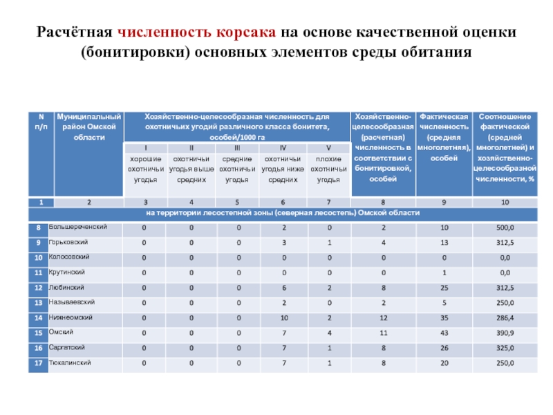 Слайд 12Расчётная численность корсака на основе качественной оценки (бонитировки) основных элементов