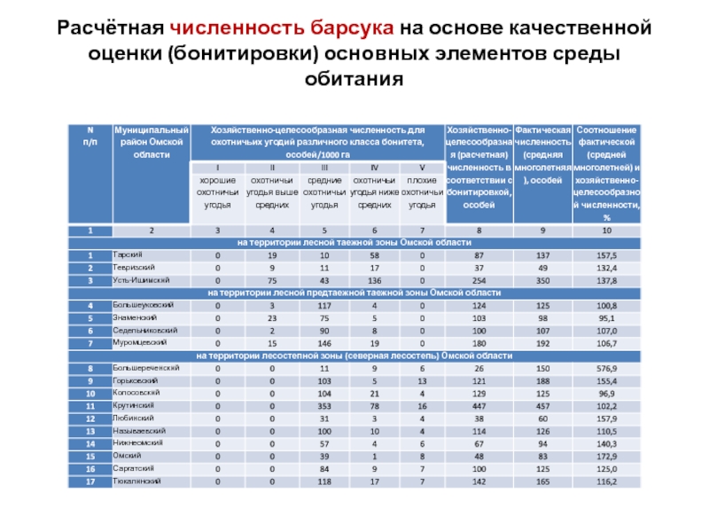 Слайд 4Расчётная численность барсука на основе качественной оценки (бонитировки) основных элементов