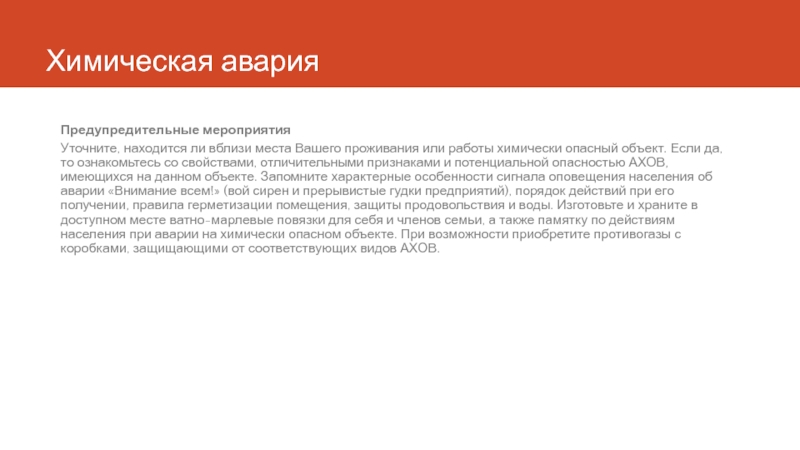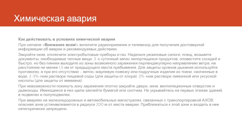 веществ. В случае возникновения опасности по радиотрансляционным сетям, радиовещательным станциям и телевизионным приемникам будет передан текст об опасности и информация о действиях населения. При аварии с выбросом аварийно-опасных химических веществ будет сообщено на каких улицах населению оставаться в квартирах, за герметизировать их, надеть влажную марлевую повязку, отключить потребителей электроэнергии, а на каких немедленно выходить из зоны заражения в указанных направлениях, взяв документы и деньги.