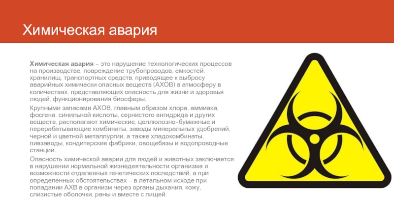 химически опасных веществ (АХОВ) в атмосферу в количествах, представляющих опасность для жизни и здоровья людей, функционирования биосферы.