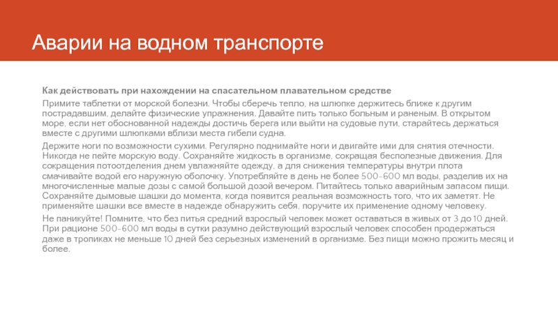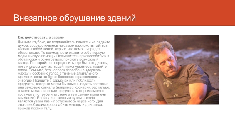 любой ценой, верьте, что помощь придет обязательно. По возможности окажите себе первую медицинскую помощь. Попытайтесь приспособиться к обстановке и осмотреться, поискать возможный выход. Постарайтесь определить, где Вы находитесь, нет ли рядом других людей: прислушайтесь, подайте голос. Помните, что человек способен выдержать жажду и особенно голод в течение длительного времени, если не будет бесполезно расходовать энергию. Поищите в карманах или поблизости предметы, которые могли бы помочь подать световые или звуковые сигналы (например, фонарик, зеркальце, а также металлические предметы, которыми можно постучать по трубе или стене и тем самым привлечь внимание). Если единственным путем выхода является узкий лаз – протиснитесь через него. Для этого необходимо расслабить мышцы и двигаться, прижав локти к телу.