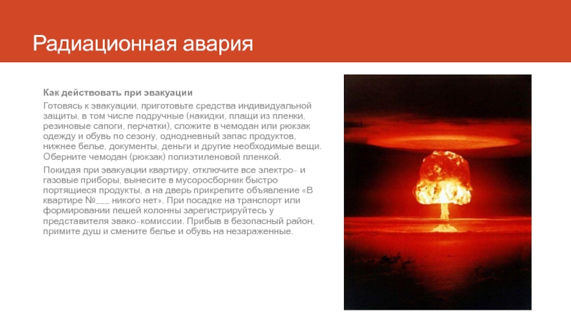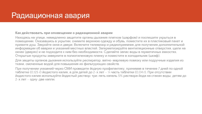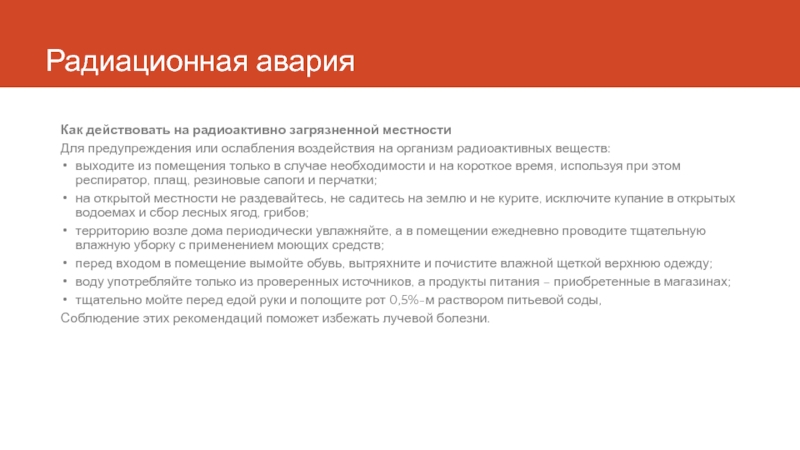 Действия населения: если Вы находитесь дома, необходимо: - взять с собой личные документы, средства индивидуальной защиты, запас воды и продовольствия, - отключить потребители электроэнергии, воду, газ, - плотно закрыть окна, форточки, вентиляционные устройства, - принять меры по защите продуктов, воды и пищи от заражения, - убыть в убежище. Если сигнал тревоги застал Вас на рабочем месте, действуйте согласно инструкции, предусматривающей немедленное прекращение работ с безаварийной остановкой оборудования и переводом процессов непрерывного цикла на безопасный режим работы, с последующим убытием в укрытие. В городском транспорте необходимо выйти из транспорта в месте его остановки и действовать по указанию постов ГО, милиции, водителей. В общественных местах действовать по указанию администрации, постов ГО, милиции. Во всех случаях укрыться в ближайшем укрытии, а при его отсутствии использовать овраги, насыпи, ямы.
