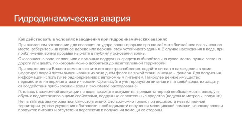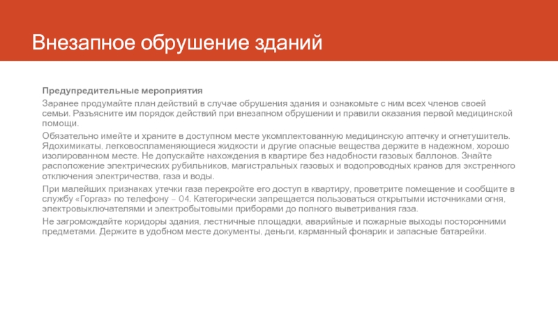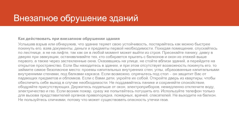 покинуть его, взяв документы, деньги и предметы первой необходимости. Покидая помещение, спускайтесь по лестнице, а не на лифте, так как он в любой момент может выйти из строя. Пресекайте панику, давку в дверях при эвакуации, останавливайте тех, кто собирается прыгать с балконов и окон из этажей выше первого, а также через застекленные окна. Оказавшись на улице, не стойте вблизи зданий, а перейдите на открытое пространство. Если Вы находитесь в здании, и при этом отсутствует возможность покинуть его, то займите самое безопасное место: проемы капитальных внутренних стен, углы, образованные капитальными внутренними стенами, под балками каркаса. Если возможно, спрячьтесь под стол – он защитит Вас от падающих предметов и обломков. Если с Вами дети, укройте их собой. Откройте дверь из квартиры, чтобы обеспечить себе выход в случае необходимости. Не поддавайтесь панике и сохраняйте спокойствие, ободряйте присутствующих. Держитесь подальше от окон, электроприборов, немедленно отключите воду, электричество и газ. Если возник пожар, сразу же попытайтесь потушить его. Используйте телефон только для вызова представителей органов правопорядка, пожарных, врачей, спасателей. Не выходите на балкон. Не пользуйтесь спичками, потому что может существовать опасность утечки газа.