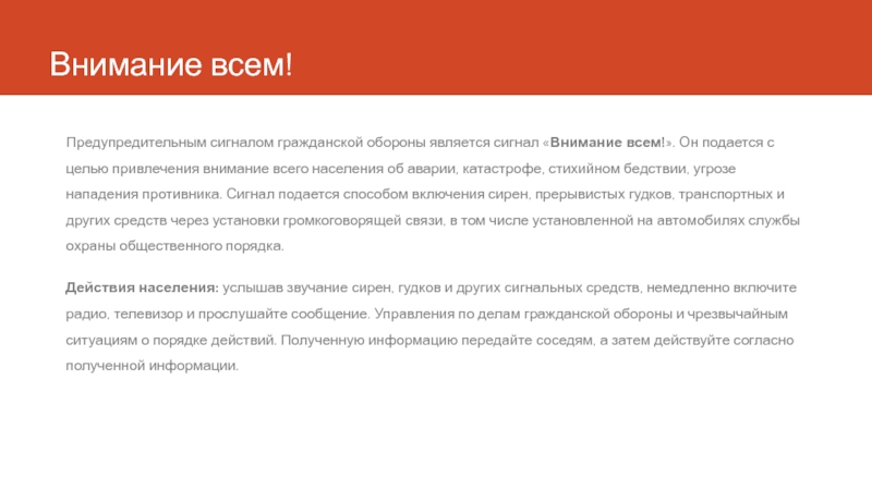 Предупредительным сигналом гражданской обороны является сигнал «Внимание всем!». Он