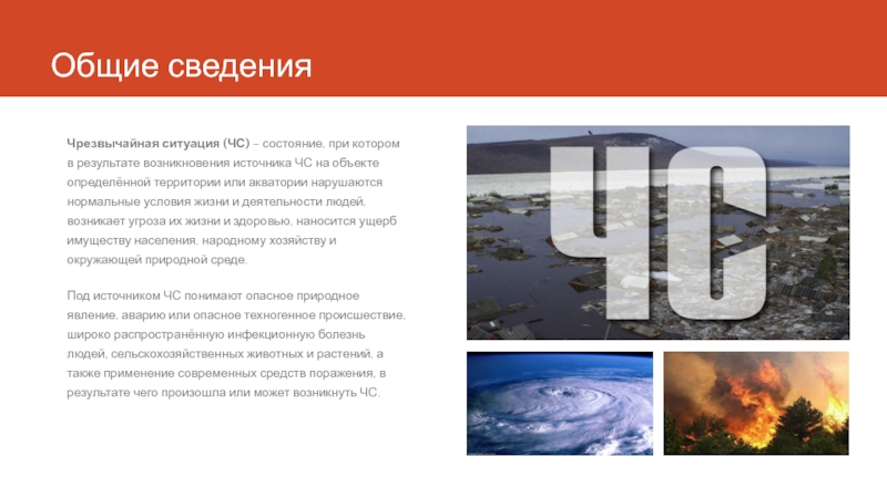 Под источником ЧС понимают опасное природное явление, аварию или опасное техногенное происшествие, широко распространённую инфекционную болезнь людей, сельскохозяйственных животных и растений, а также применение современных средств поражения, в результате чего произошла или может возникнуть ЧС.