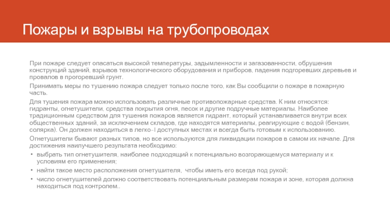 Для тушения пожара можно использовать различные противопожарные средства. К ним относятся: гидранты, огнетушители, средства покрытия огня, песок и другие подручные материалы. Наиболее традиционным средством для тушения пожаров является гидрант, который устанавливается внутри всех общественных зданий, за исключением складов, где находятся материалы, реагирующие с водой (бензин, солярка). Он должен находиться в легко-I доступных местах и всегда быть готовым к использованию.