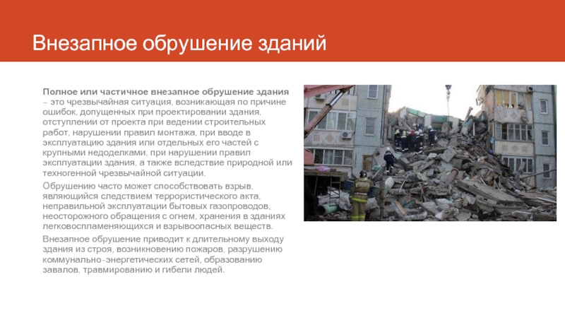 Внезапное обрушение приводит к длительному выходу здания из строя, возникновению пожаров, разрушению коммунально-энергетических сетей, образованию завалов, травмированию и гибели людей.