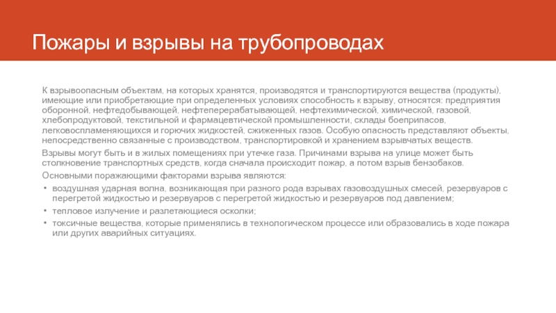 условиях способность к взрыву, относятся: предприятия оборонной, нефтедобывающей, нефтеперерабатывающей, нефтехимической, химической, газовой, хлебопродуктовой, текстильной и фармацевтической промышленности, склады боеприпасов, легковоспламеняющихся и горючих жидкостей, сжиженных газов. Особую опасность представляют объекты, непосредственно связанные с производством, транспортировкой и хранением взрывчатых веществ.