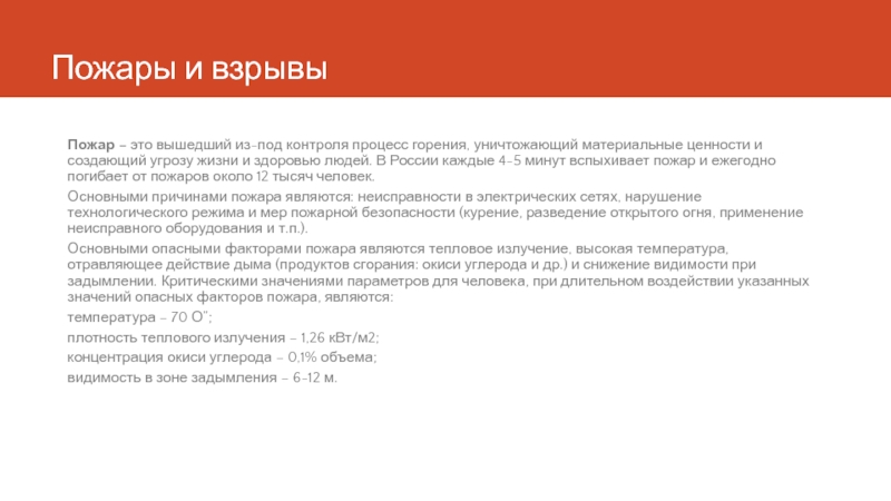 Основными опасными факторами пожара являются тепловое излучение, высокая температура, отравляющее действие дыма (продуктов сгорания: окиси углерода и др.) и снижение видимости при задымлении. Критическими значениями параметров для человека, при длительном воздействии указанных значений опасных факторов пожара, являются: