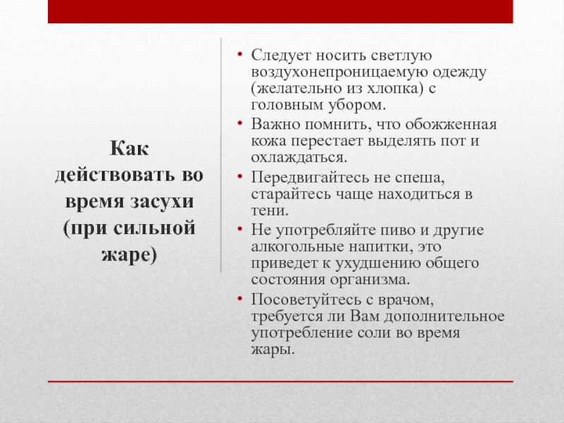 Слайд 37Следует носить светлую воздухонепроницаемую одежду (желательно из хлопка) с головным