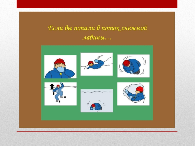 Слайд 27Закройте нос и рот рукавицей, шарфом, воротником; двигаясь в лавине,