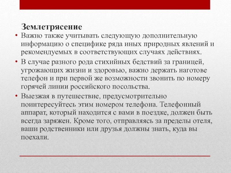 рода стихийных бедствий за границей, угрожающих жизни и здоровью, важно держать наготове телефон и при первой же возможности звонить по номеру горячей линии российского посольства.