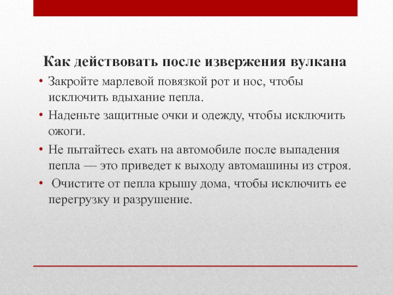 Слайд 13Как действовать после извержения вулкана
