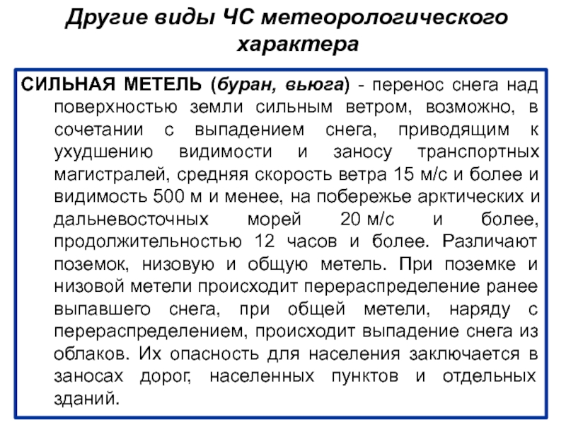 выпадением снега, приводящим к ухудшению видимости и заносу транспортных магистралей, средняя скорость ветра 15 м/с и более и видимость 500 м и менее, на побережье арктических и дальневосточных морей 20 м/с и более, продолжительностью 12 часов и более. Различают поземок, низовую и общую метель. При поземке и низовой метели происходит перераспределение ранее выпавшего снега, при общей метели, наряду с перераспределением, происходит выпадение снега из облаков. Их опасность для населения заключается в заносах дорог, населенных пунктов и отдельных зданий.
