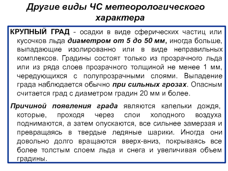 иногда больше, выпадающие изолированно или в виде неправильных комплексов. Градины состоят только из прозрачного льда или из ряда слоев прозрачного толщиной не менее 1 мм, чередующихся с полупрозрачными слоями. Выпадение града наблюдается обычно при сильных грозах. Опасным считается град с диаметром градин 20 мм и более.